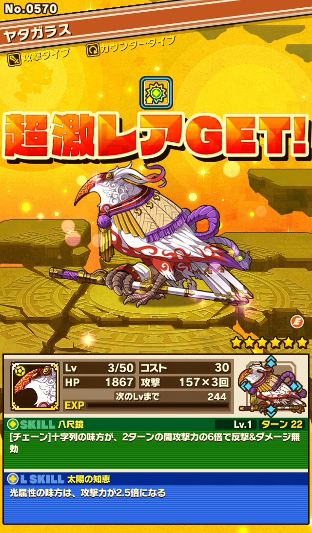 7回目、アザトース!初ゲット!2ターン無敵は強いよね。闇属性ってのが良い。スキル上げまた来たら是非ともスキルマに。