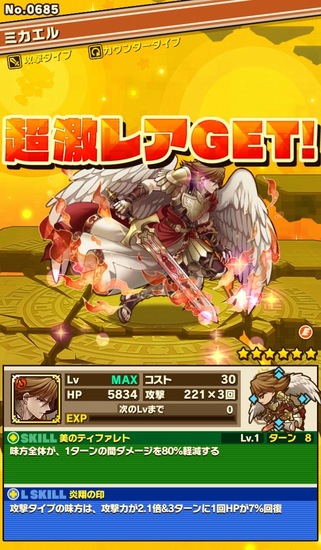 まずはミカエル。ダメージ80%減はちょっと微妙かな。。個人的には不要だと思ったので売ることに。。