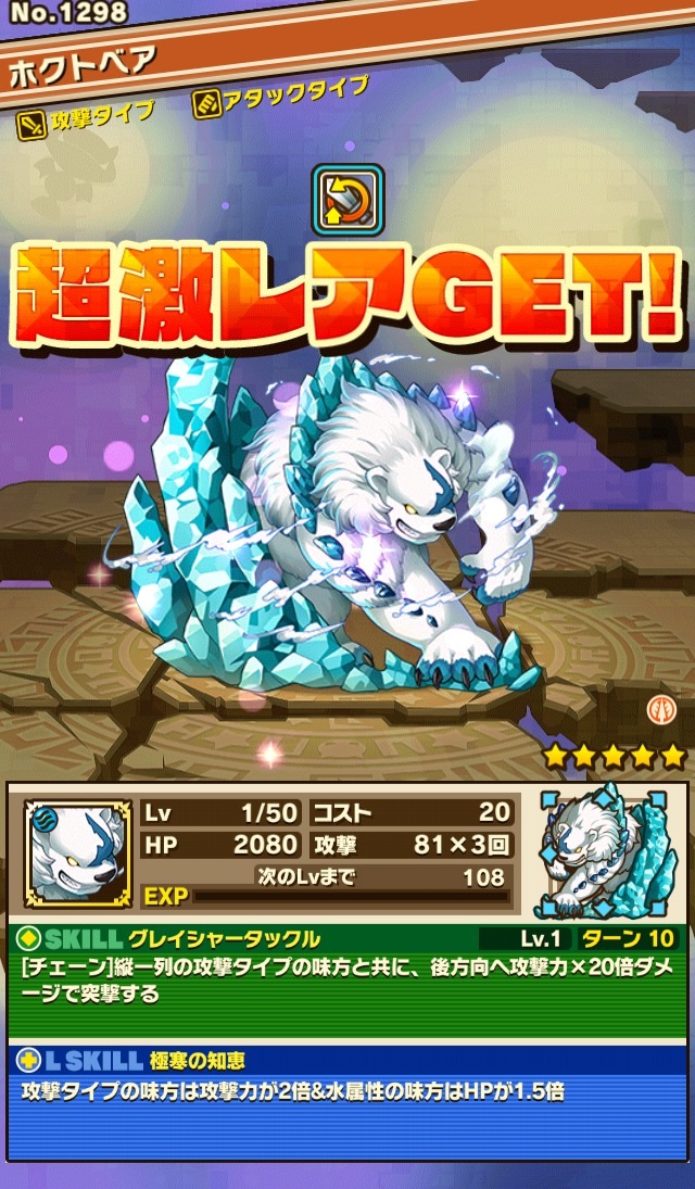 ホクトベアゲット!珍しい水の対空攻撃持ち。超貴重です。攻撃力も高いから、対飛行要員として1体持っておくといいかも。スキルはいわゆる「突撃」。正直使ったことないから分からないけど、タナトスとかダリューンは一番前まで突っ込んでった気がするから、おそらく一番後ろまで行くんだろう。右に動けないから、左に行き過ぎて移動できない時に使うといいかも。