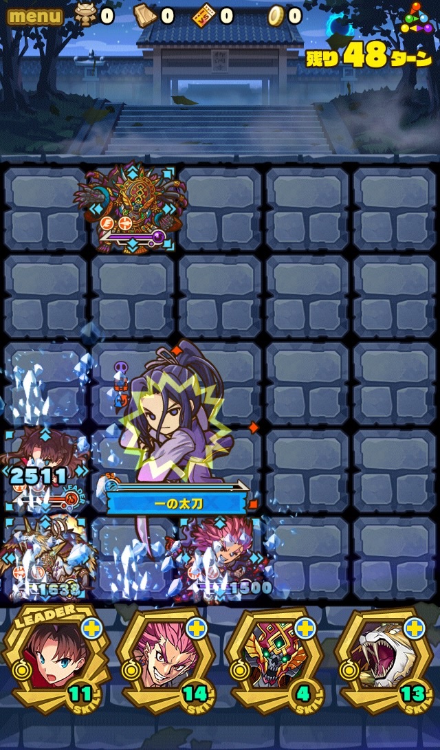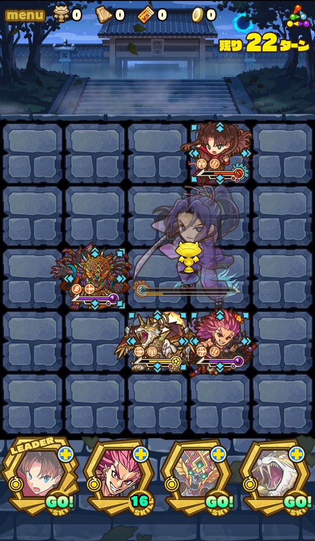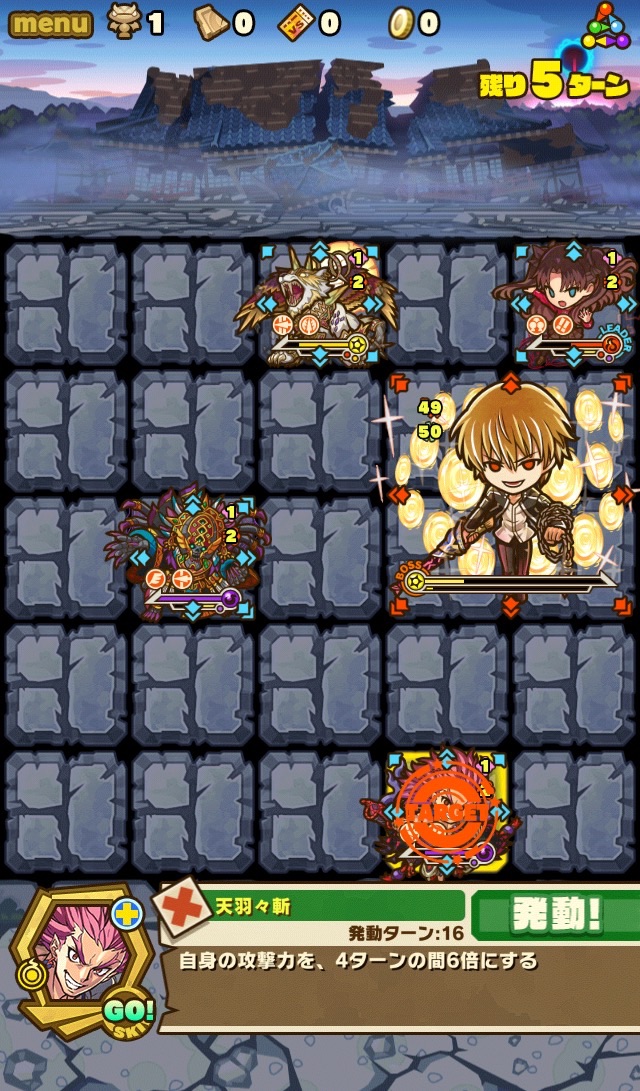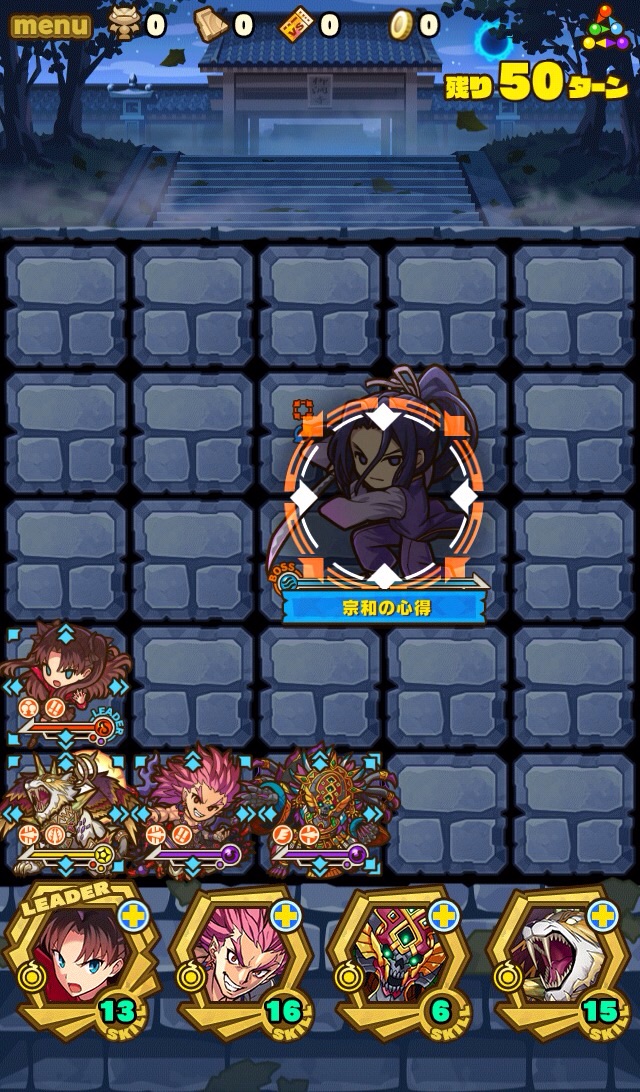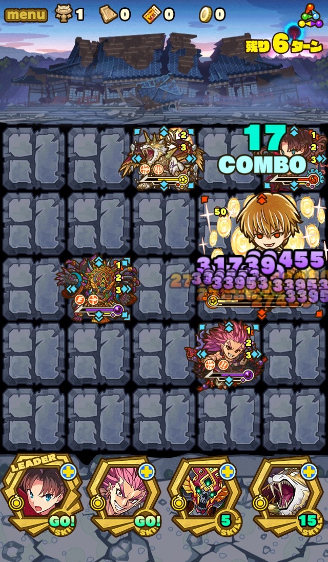 そのPTがこちら。リーダースキルが攻撃タイプ3.5倍、そしてスキルダメージ70%減。ソウルは凛(ダメージスキル強化Lv.MAX)、スサノオ(攻撃、HP強化、スキブ共にソウルLv.MAX)、ミクトランテクートリ(スキブLv.MAX)、シン(反撃ソウルちょっと)。それぞれの役割が至ってシンプルなんだけど、こんなんで果たしていけるのだろうか……。