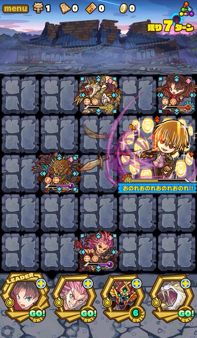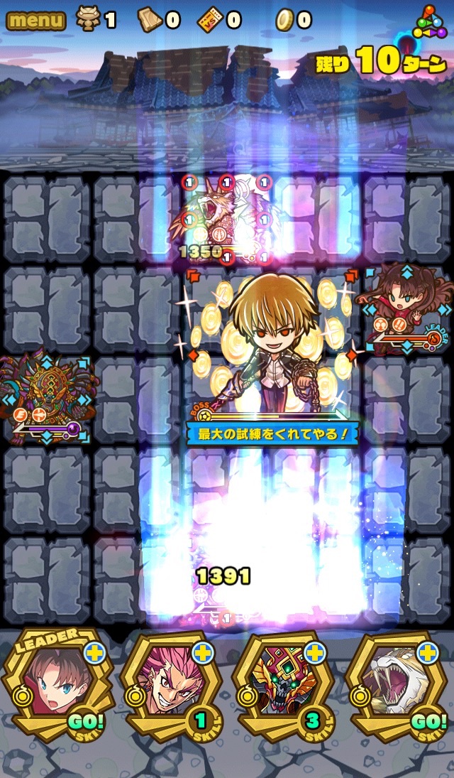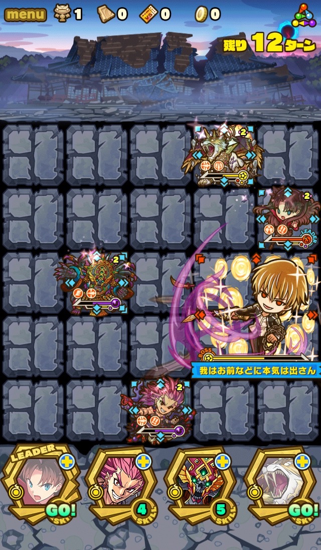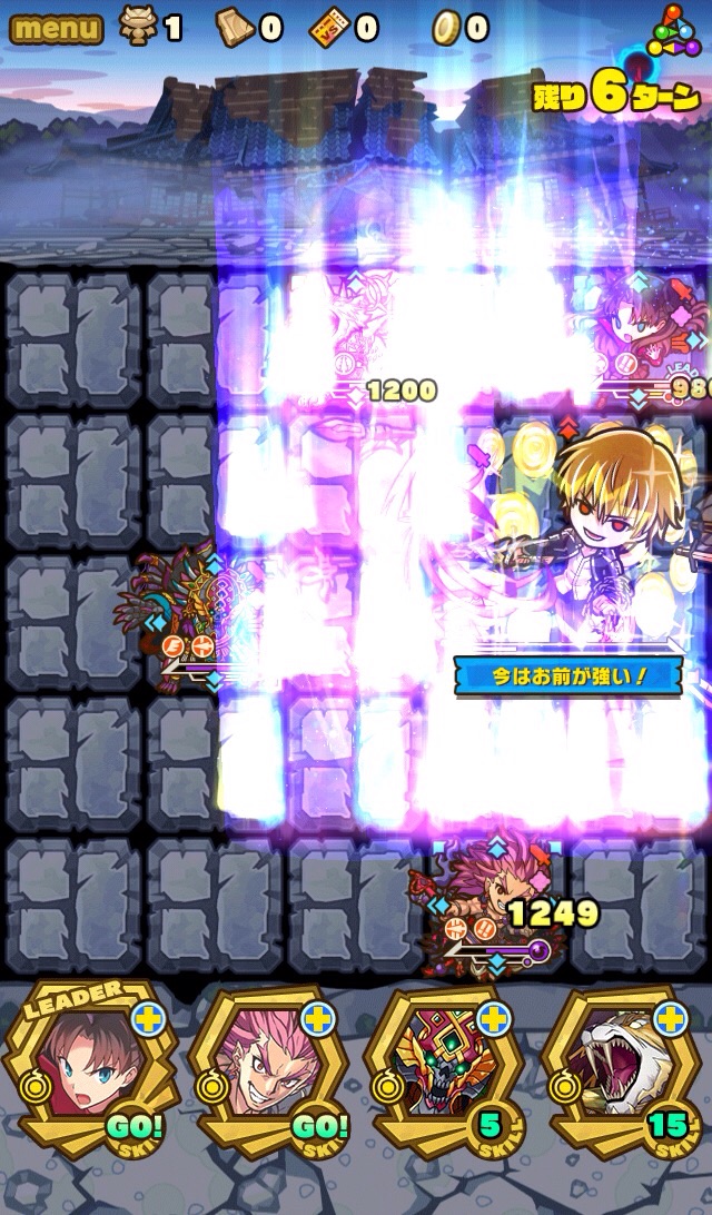 後ろのお寺が崩壊して朝焼けに現れたのが、英雄王ギルガメッシュ。先制でスキルダメージ減少を使用。