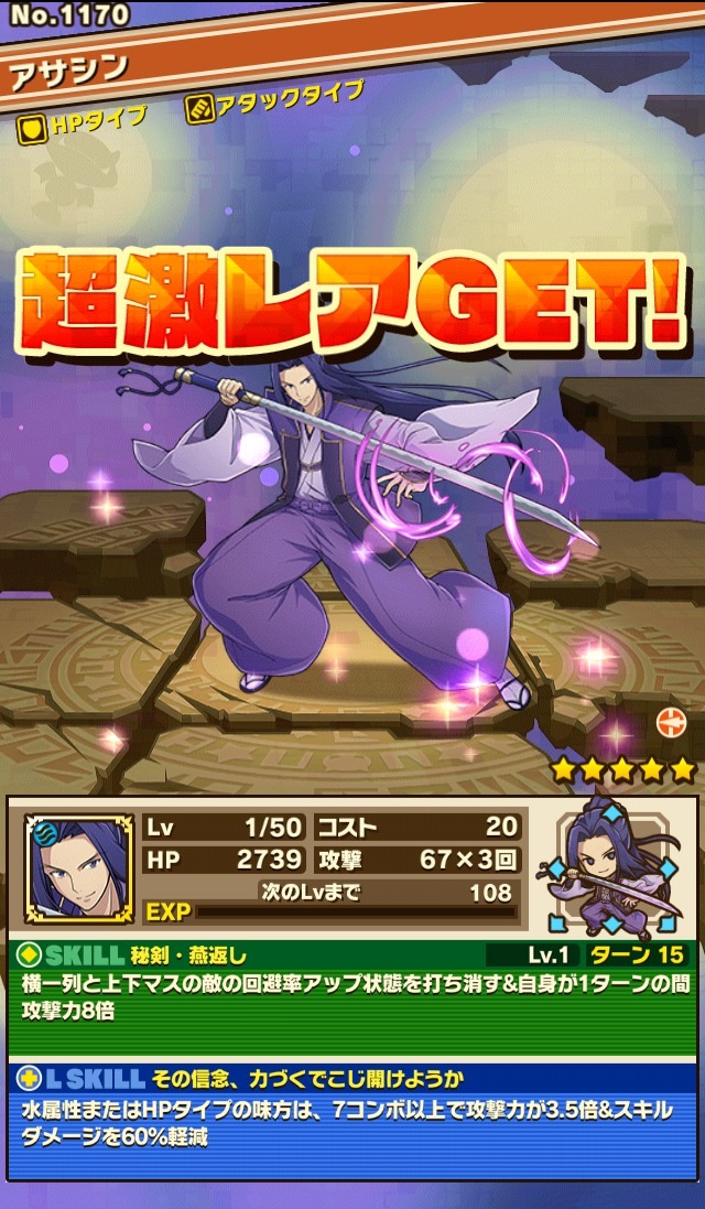 アサシンゲット。スキルがもはやフォンセ笑 攻撃力は高くないけれど、めちゃくちゃ強いんじゃないかと確信。周回する必要が出て来たな汗
