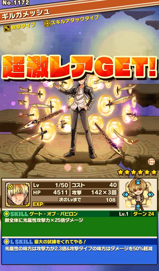 そして、ギルガメッシュも初ゲット!かなり苦労してゲットしたから喜びも一潮ですじゃ。今夜ペンダンジョン周回したいし、来週もう1回来るから今日はここまでにしておこうかなと思う。是非とも2人ともスキルマにしたいもんだ。