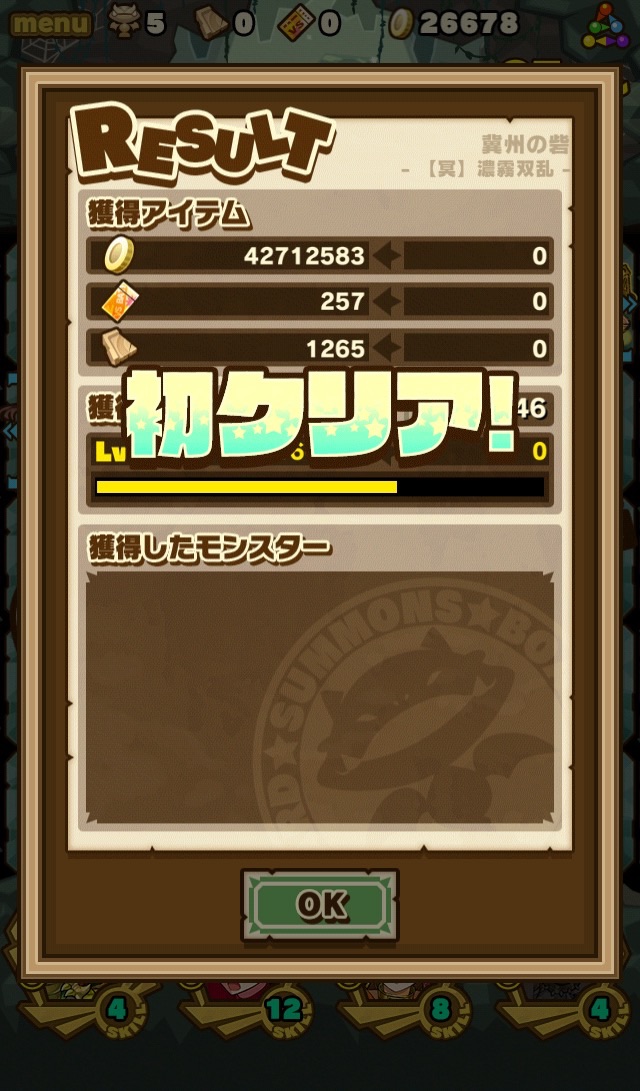 初クリアで光結晶回収!現在46個まで貯まった。人生4回目の11連がもうすぐ笑 無論、フォンセの確率が上がってる時に回したい。もう1ランク上の、現環境最強と謳われるメイガスやイフ辺りのモンスターがそろそろ欲しくなってきた所。果たしてオレのBOXにやってくる日は来るのだろうか。。