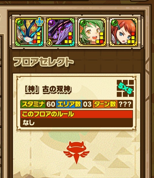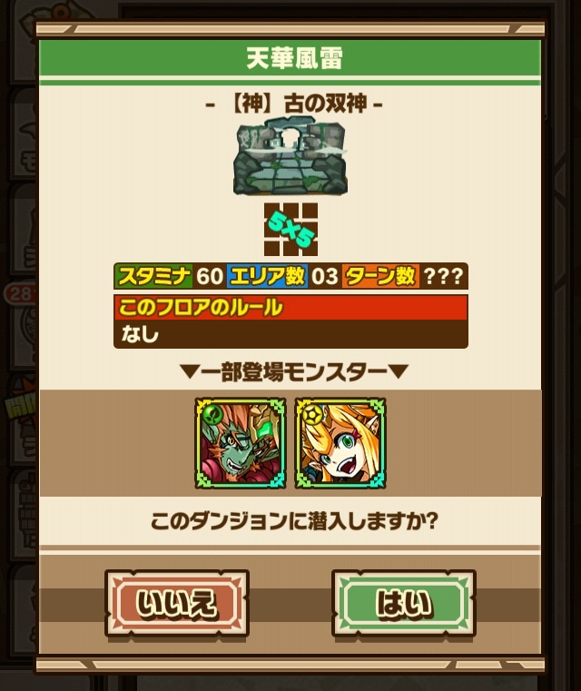 この前の土日にやって来た、新顕現ダンジョン『天華風雷』。顕現では初のボスが2体同時に登場する。挑んだのは上記のPT。コアトリクエをリーダーに、フィアドラーク、正月ダンジョンで手に入るムツキ、イシュタルといった面々。何回も挑んで勝てそうな所まで来てたため、今度は勝てる!と思って挑戦。いつも顕現ダンジョンって誰かの攻略を参考にしてたから、今回は初めて自分の力だけでやってみたかった!