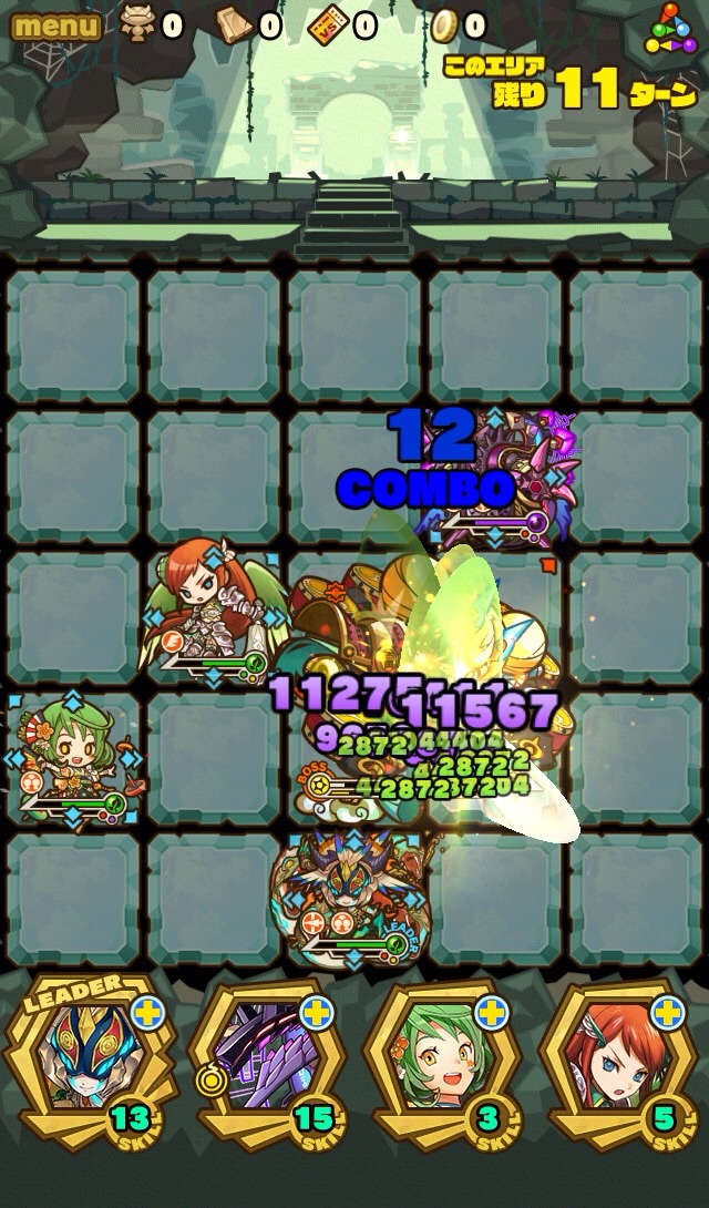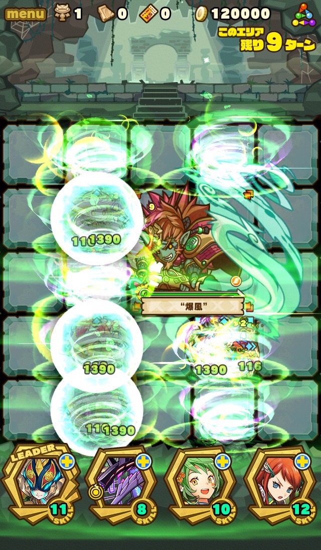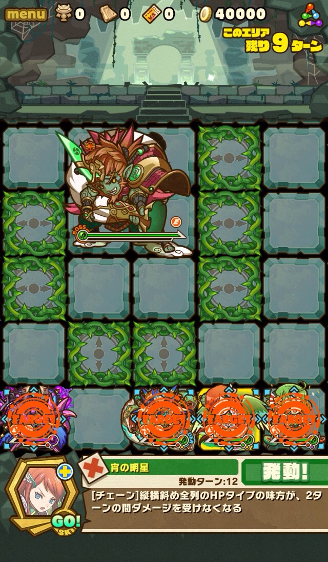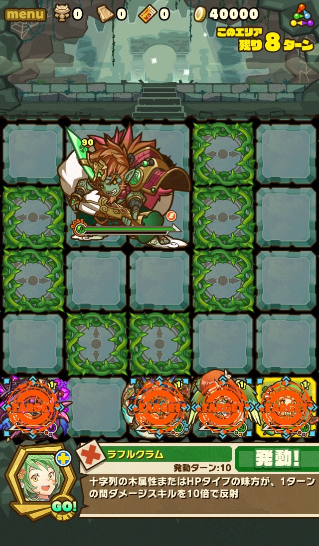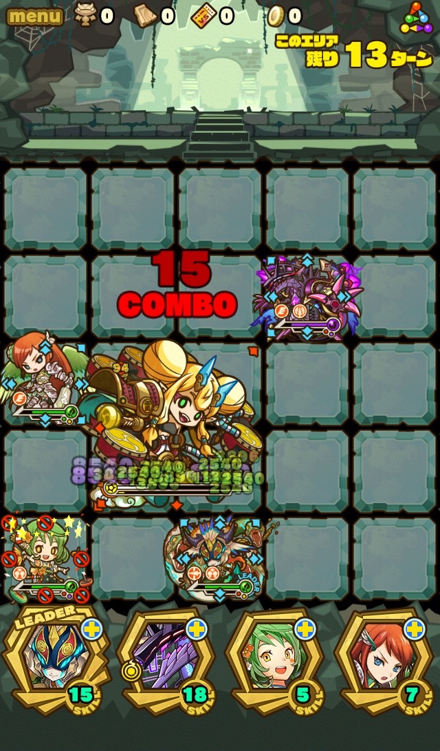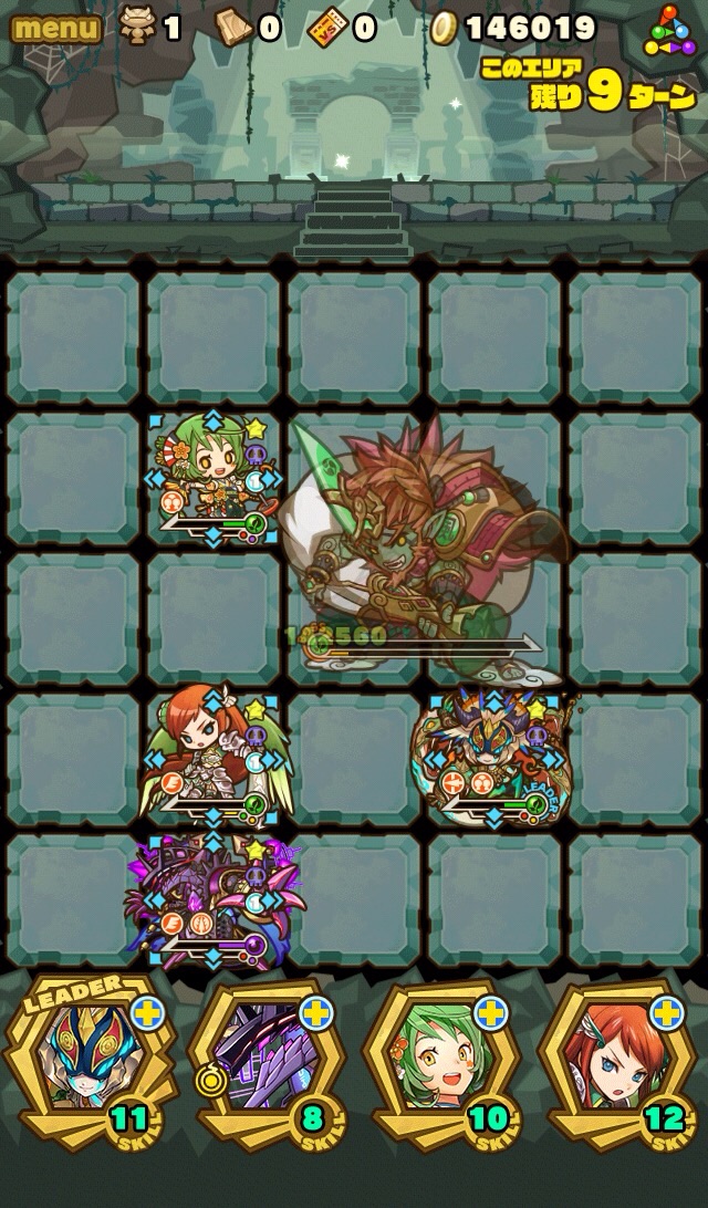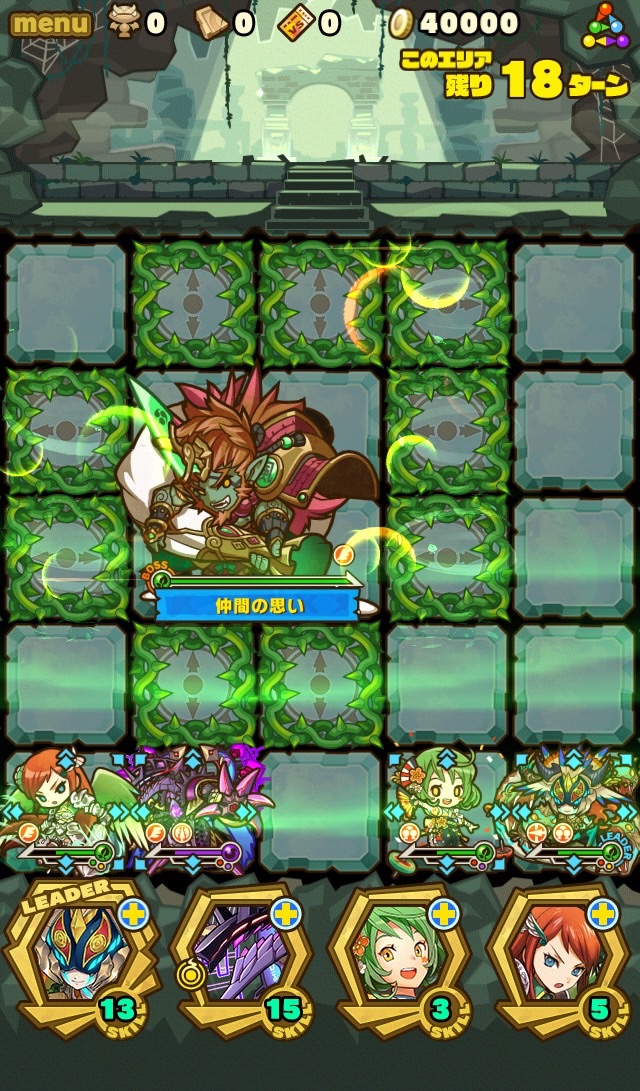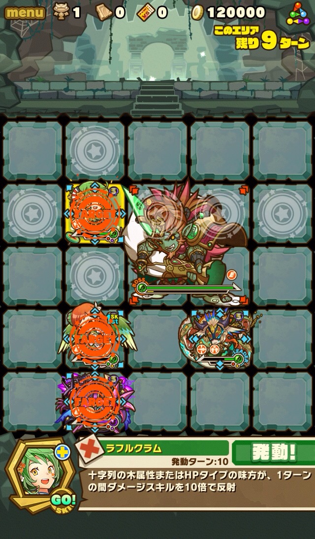先制でスキルダメージ減を使ってくる。コアトリクエは7コンボ以上で木とHPタイプの攻撃力4倍、スキルダメージを60%減。ダメージスキルをばんばんぶっ放してくるため、この軽減は本当に助かった。