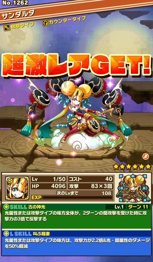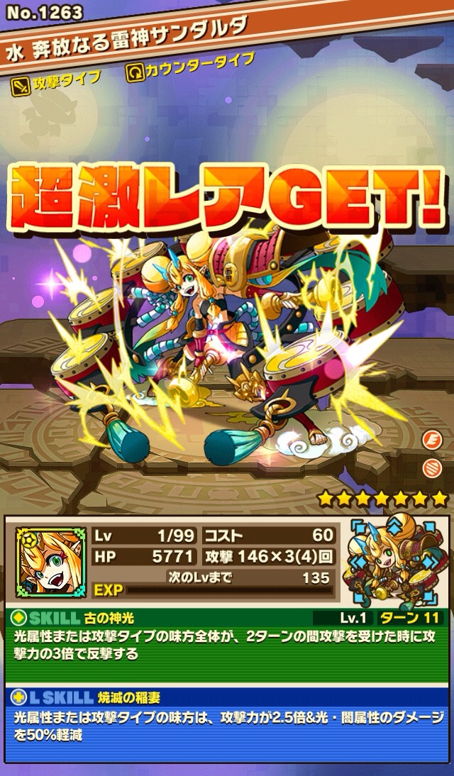 サンダルダはLv.6まで上がってくれた!サンダルダ使いたいなって考えると、どうしてもペルーンが欲しくなる!w雷神同士ってのがすごくいい笑