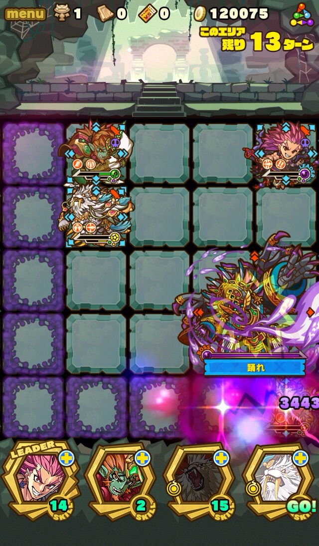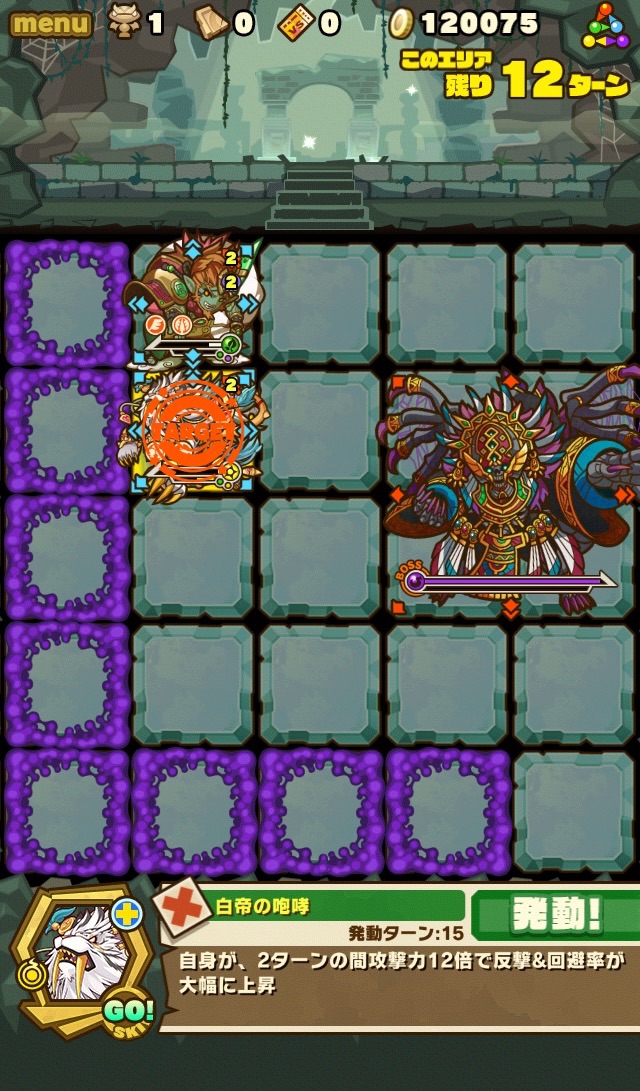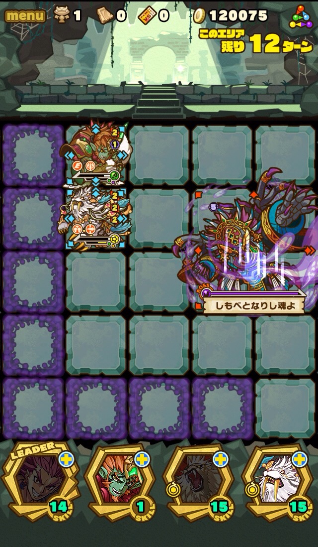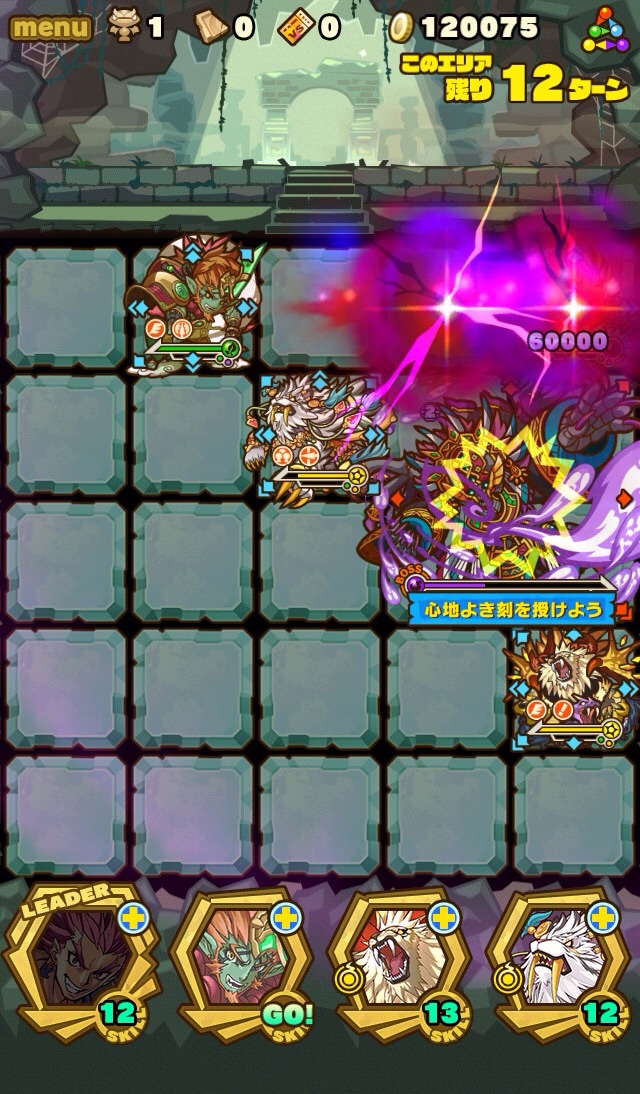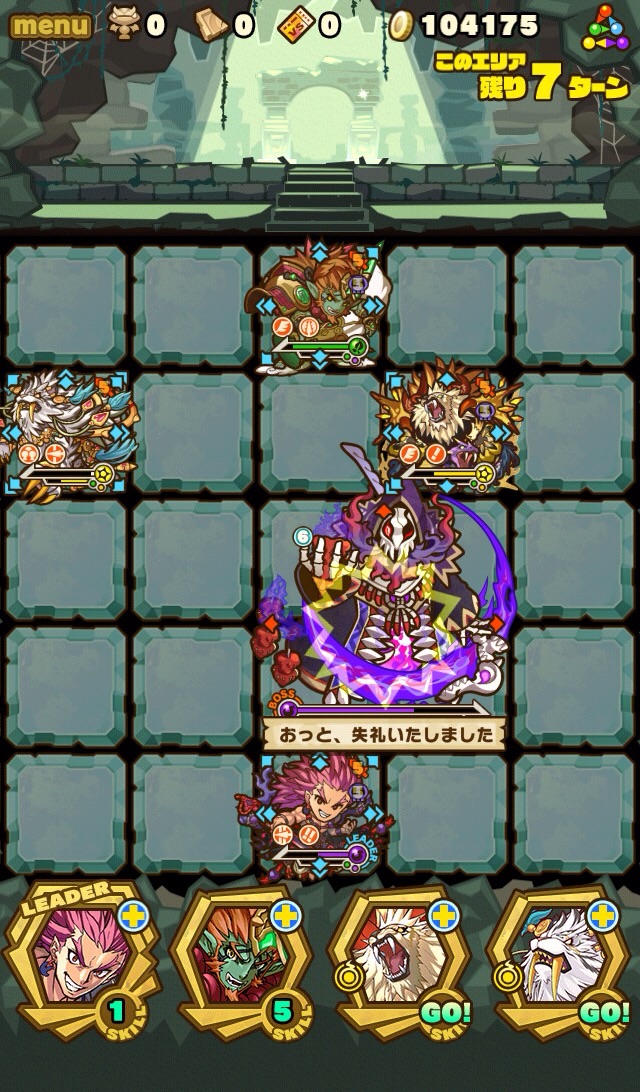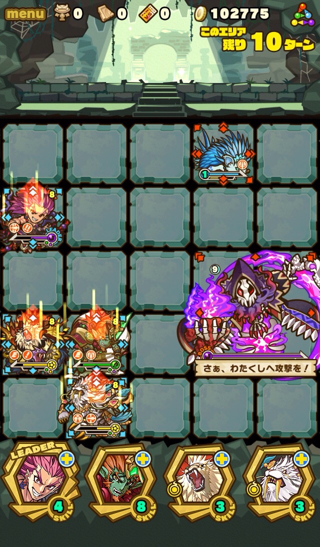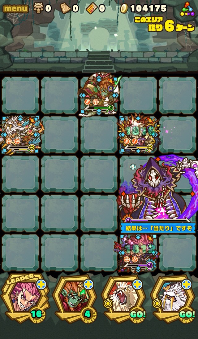 そして、残り7ターンになると十字列に毒。これを出来れば食らわないように配置したい。ランダム配置なため、全員が回避するのは難しい。