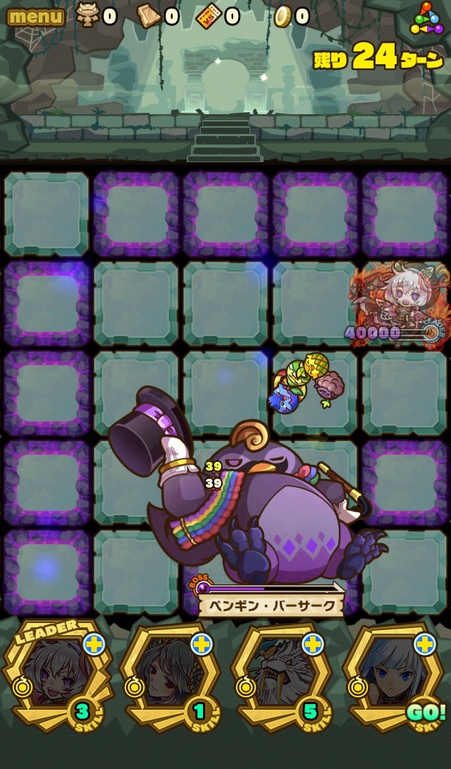 だが、割り込みスキルが来て、まさかのノックバックwww ダメージトラップを全員踏んだのは言うまでもない。。。。悔しいなあ、ここまで頑張ったのに。改めて配置って重要だなと学びました。パパペンは倒したら必ずチビペン落とすから是非とも倒したい。次回頑張ろうw