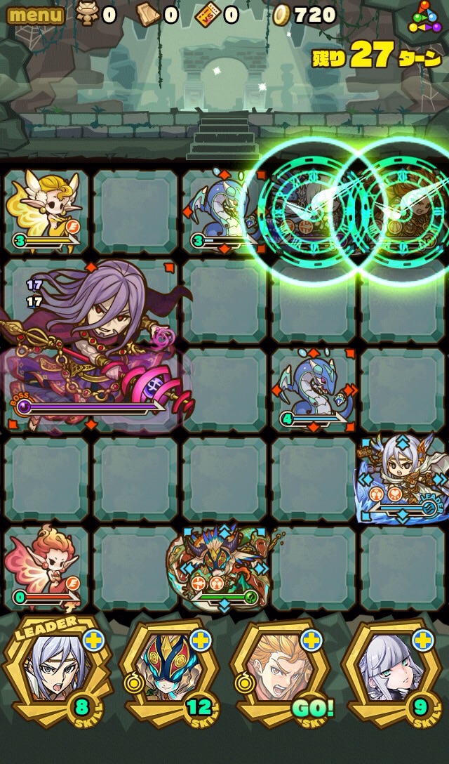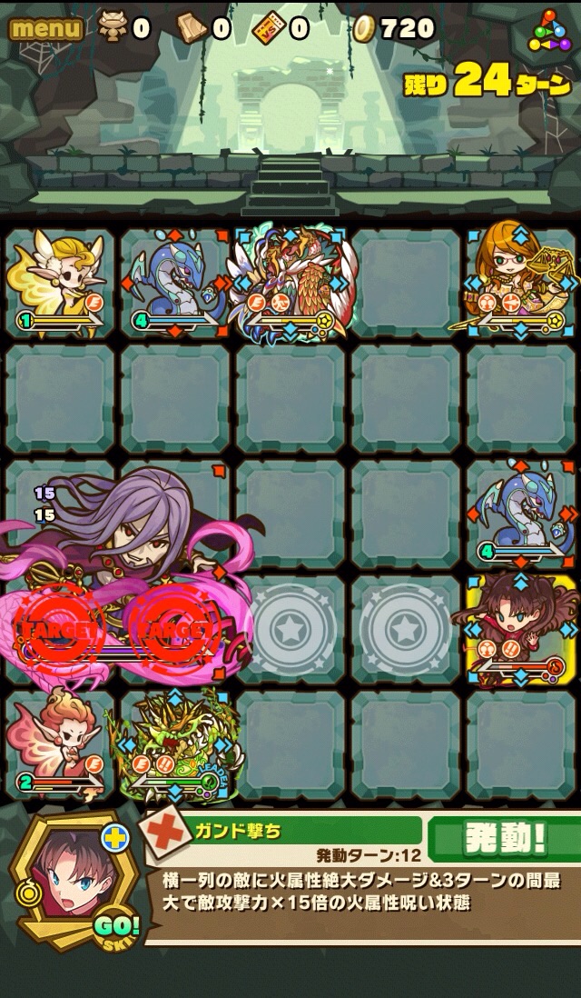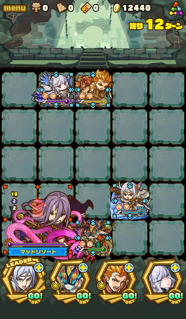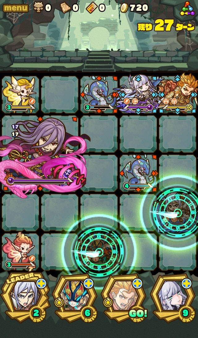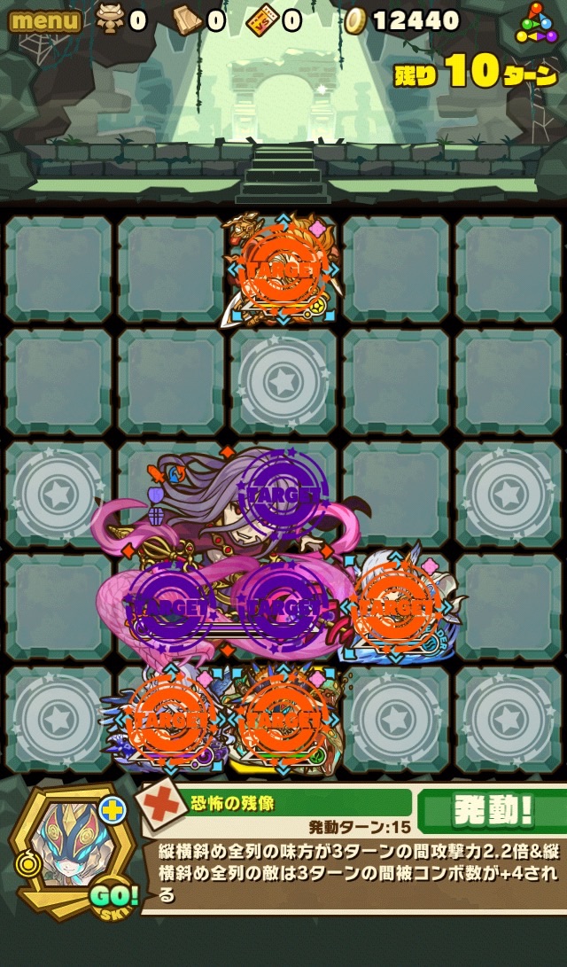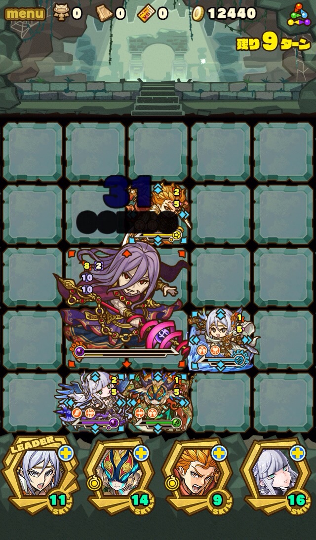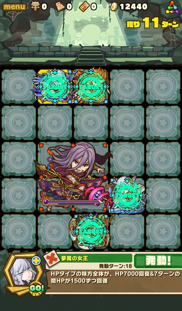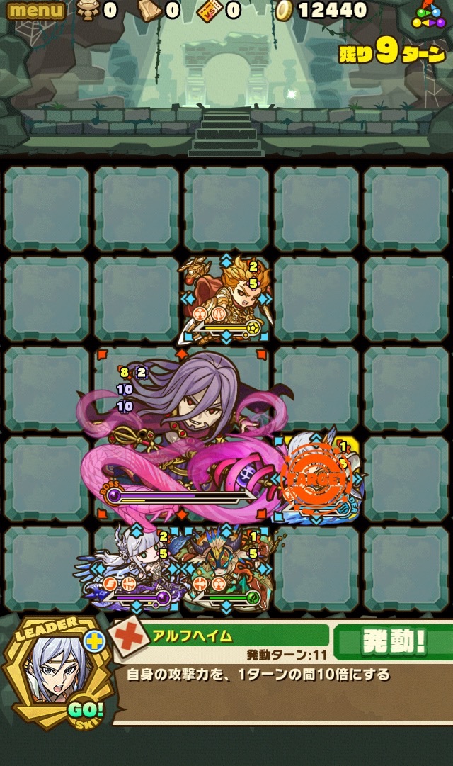 雑魚も復活して来なくなるまで倒しきり、10ターンが経過。すると、真ん中の9マスに毒攻撃。この毒を食らうと毎ターン10000以上のダメージを受け続けるため、絶対に受けないように注意。