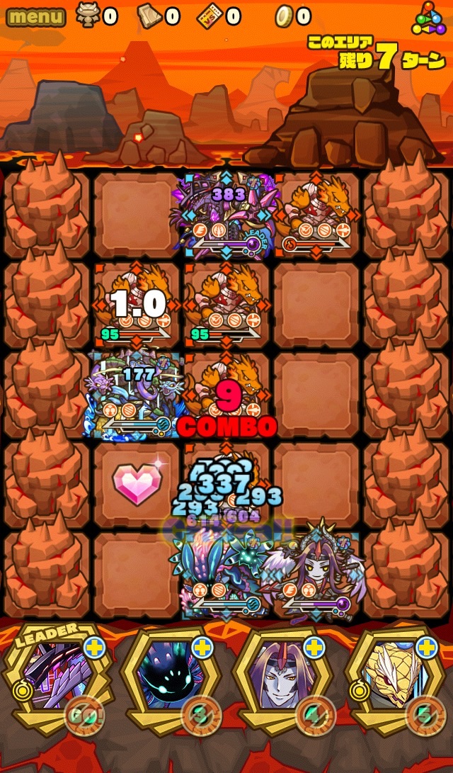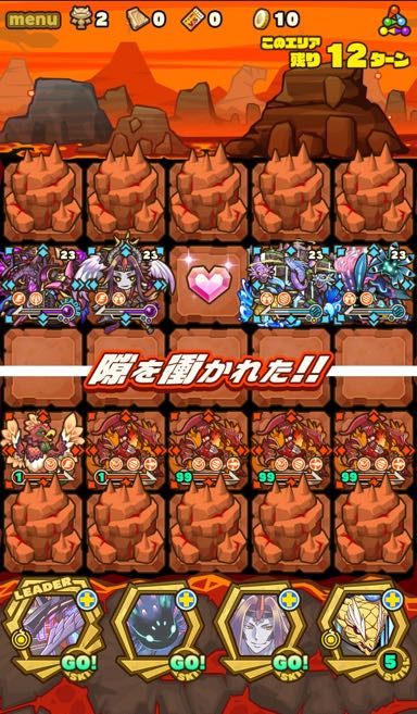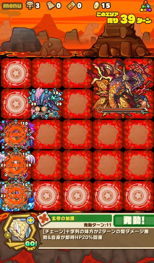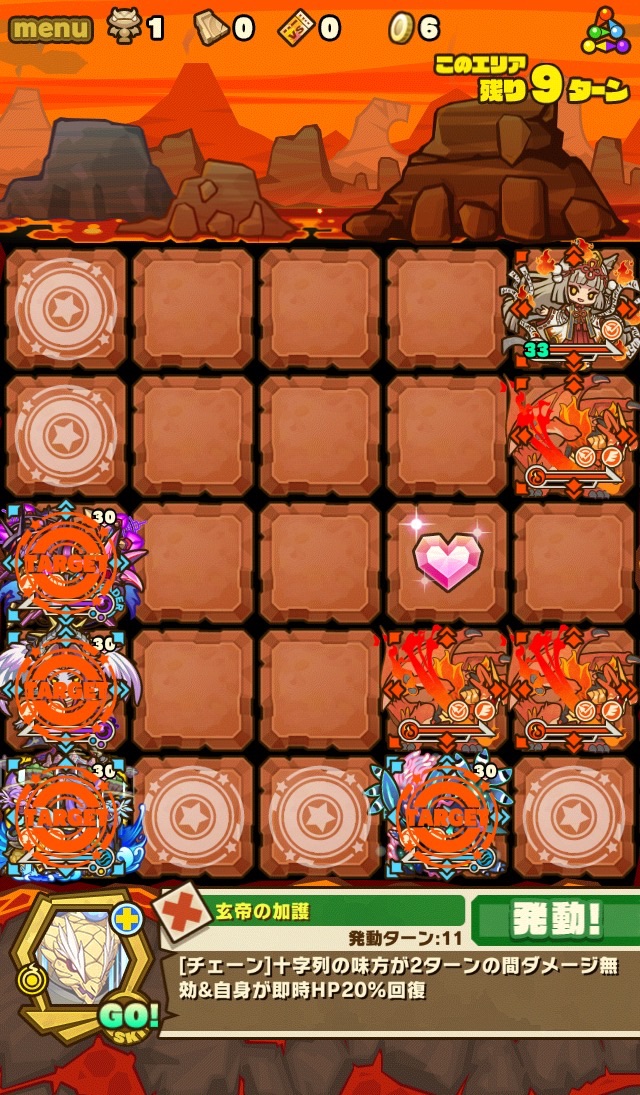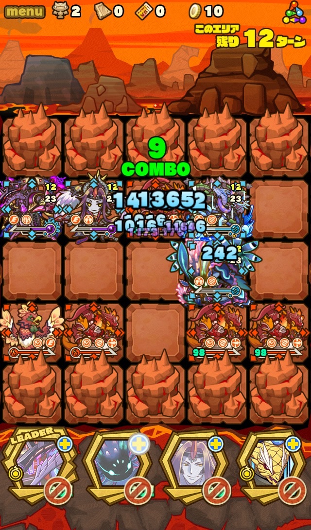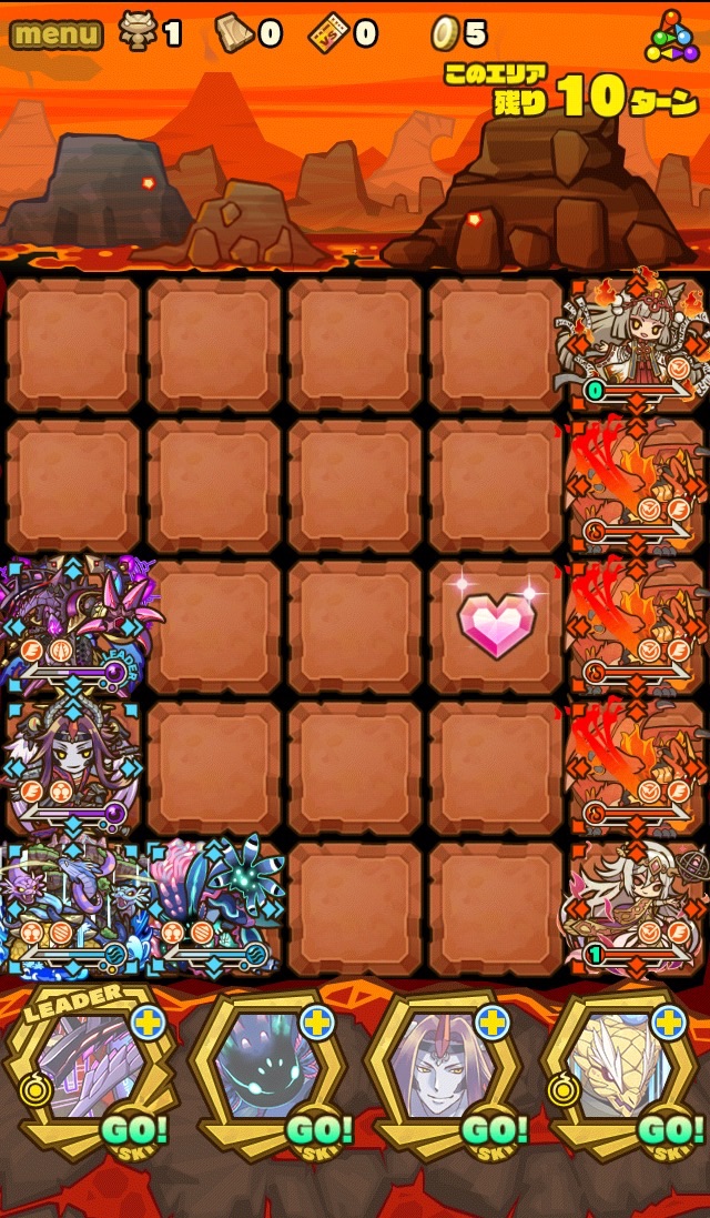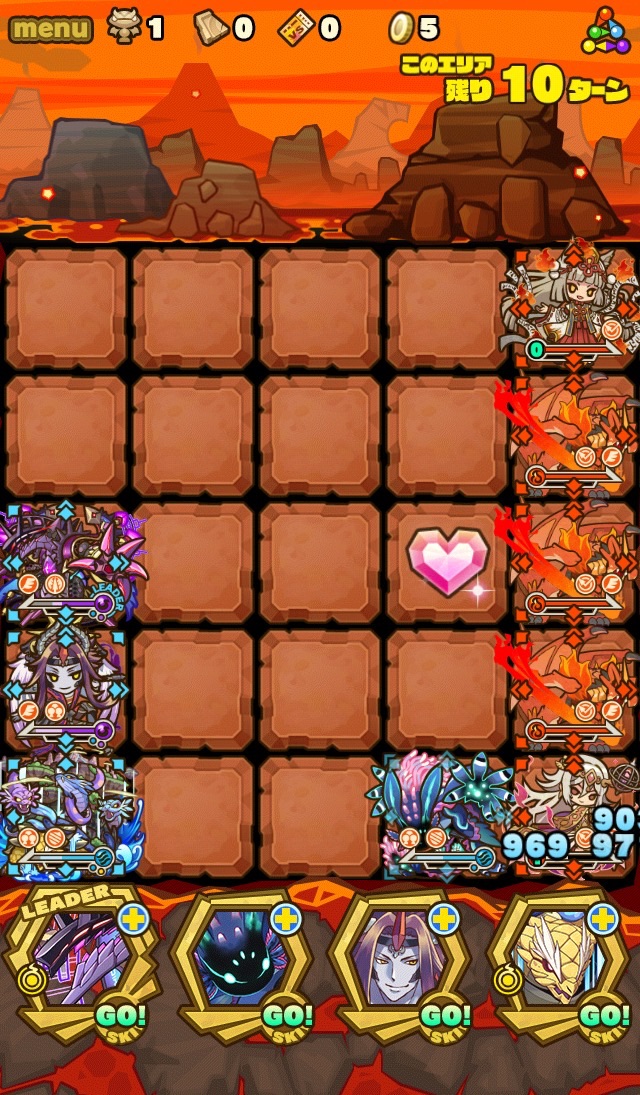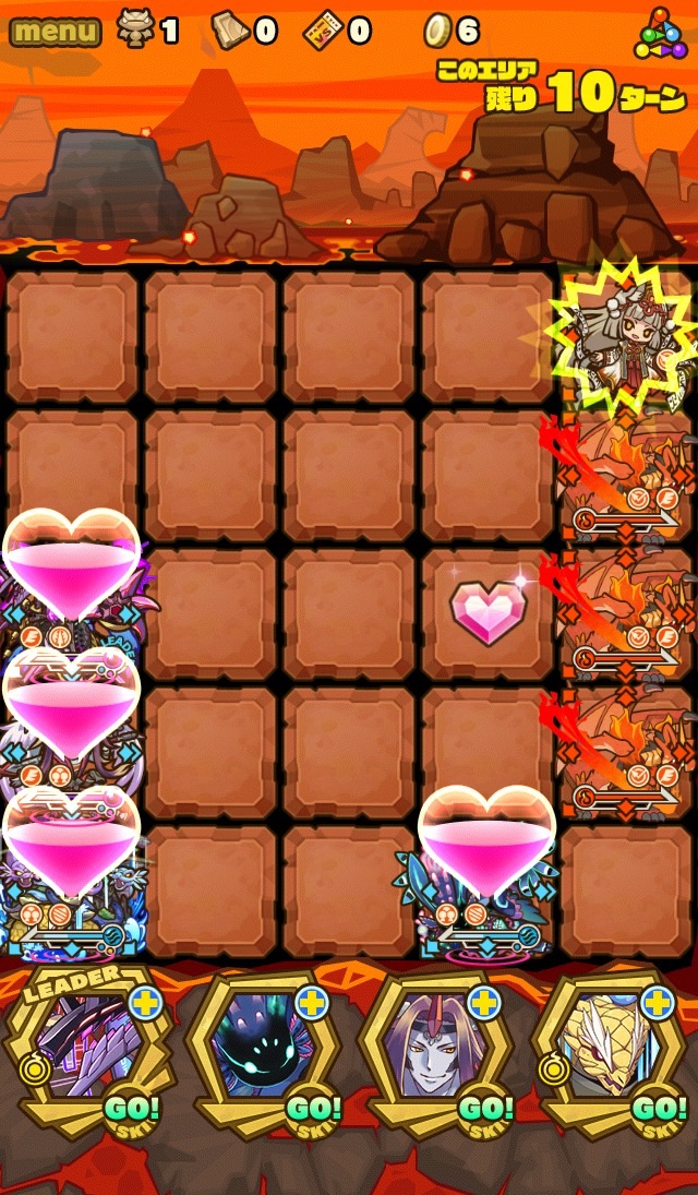 ここの特徴はスキル封印10ターン食らうから殴り合いで突破する事。ハートが毎ターン湧くため、全体化持ちで取りながら戦う。あと非常に敵もスタンしやすい。防御力も高いため3体くらいで囲んで行きたい。こちらはフィアドラ以外が全員全体化持ちだからハートを取りやすくて助かる。