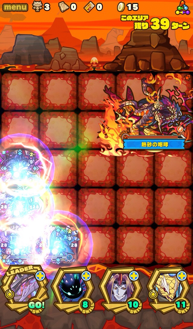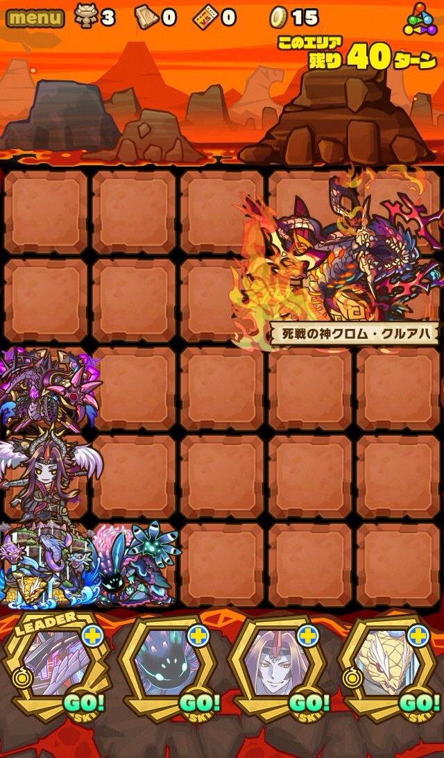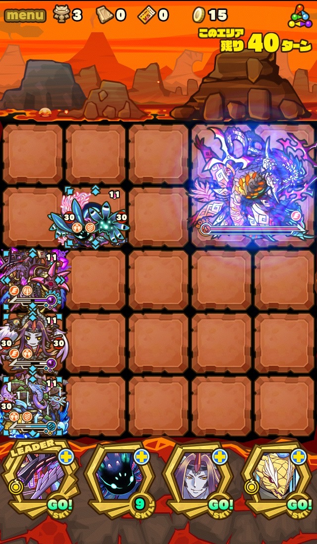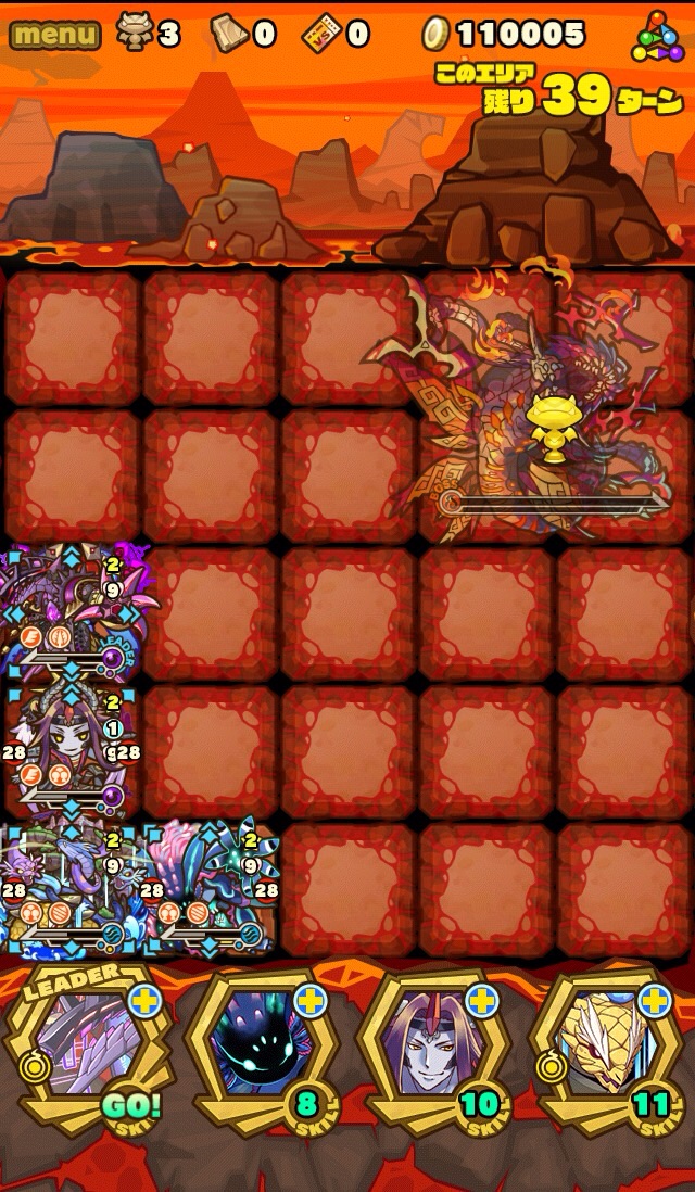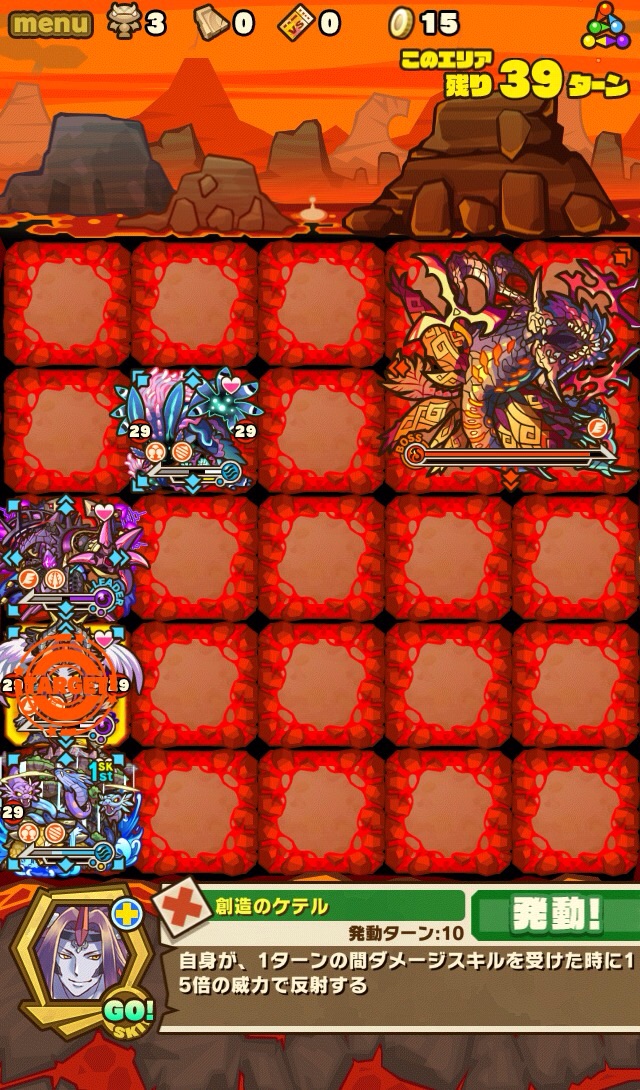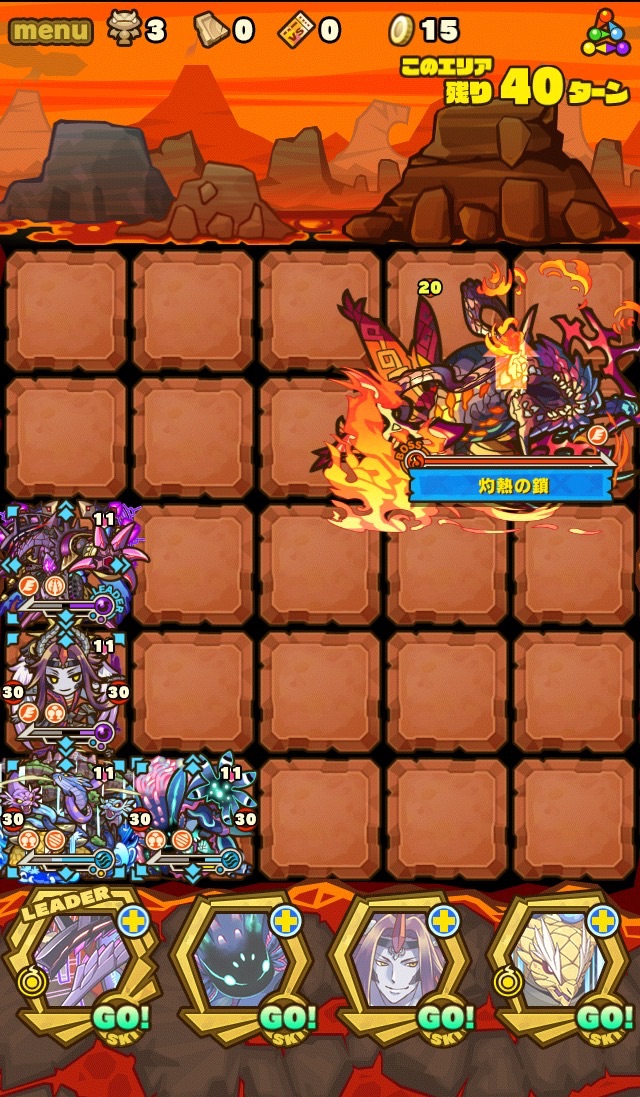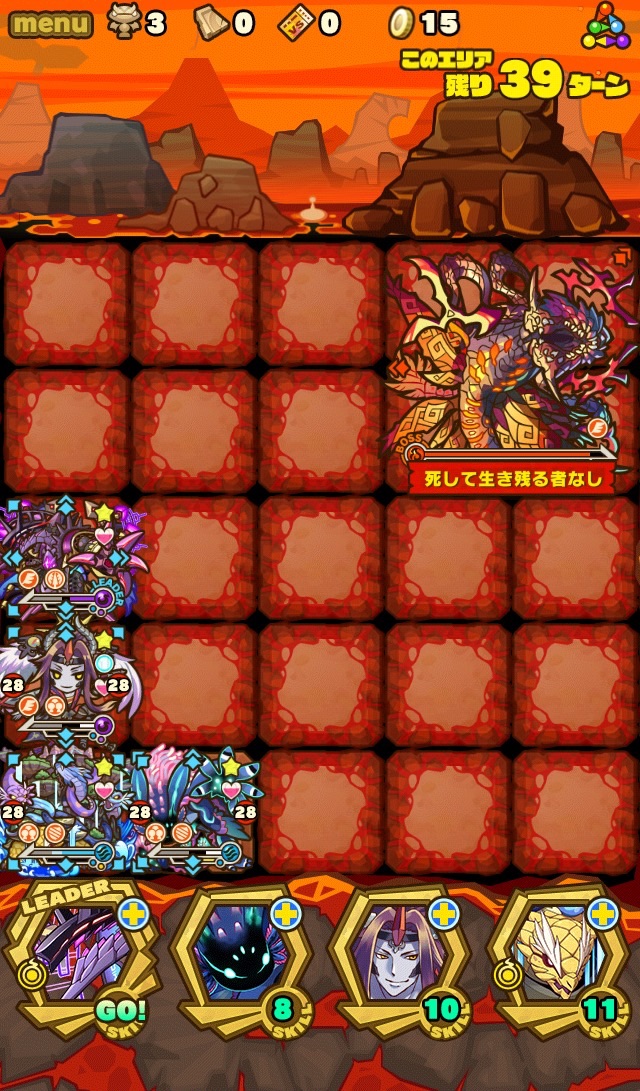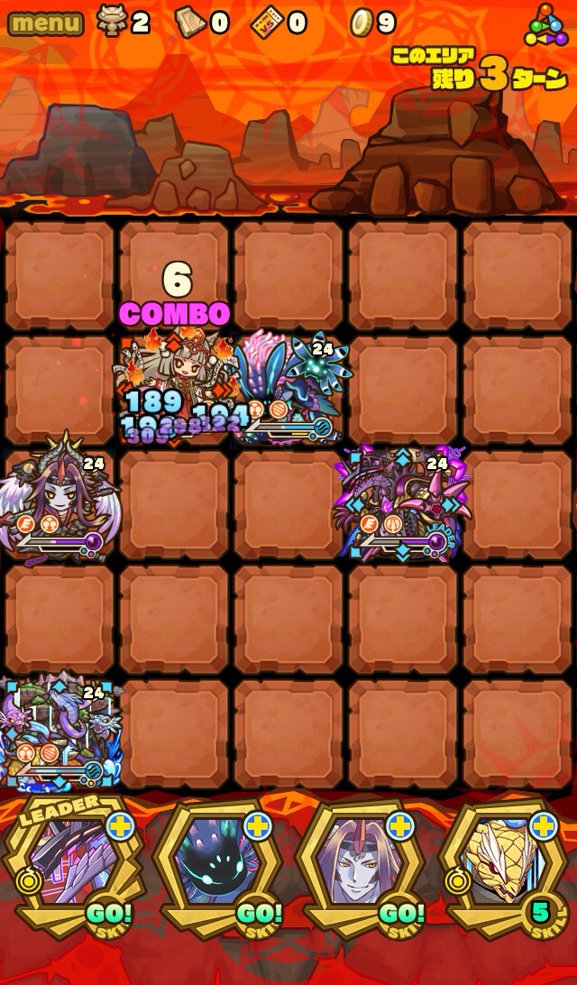 ここの特徴はスキル封印10ターン食らうから殴り合いで突破する事。ハートが毎ターン湧くため、全体化持ちで取りながら戦う。あと非常に敵もスタンしやすい。防御力も高いため3体くらいで囲んで行きたい。こちらはフィアドラ以外が全員全体化持ちだからハートを取りやすくて助かる。