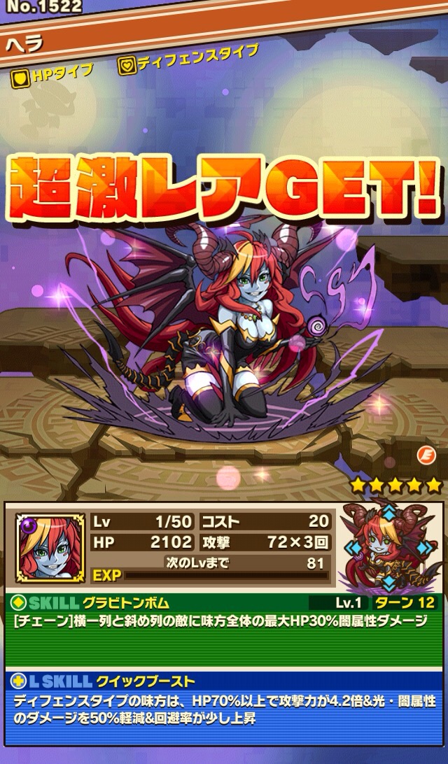 ヘラゲット!ディフェンスPTでリーダーとして使えそう。回避率上がるのって結構嬉しい!スキルもHP依存ダメージで範囲も広くて優秀。ダークネイヴァーのサブに入れたら面白いかも。