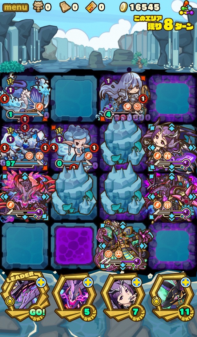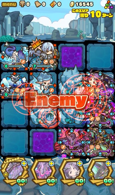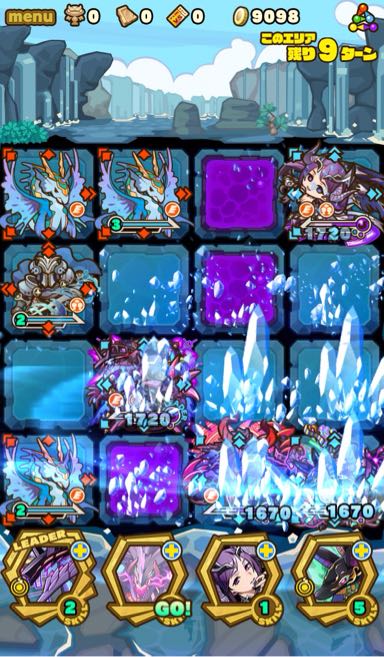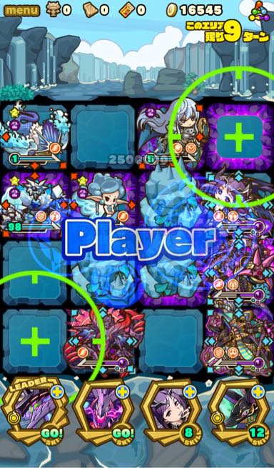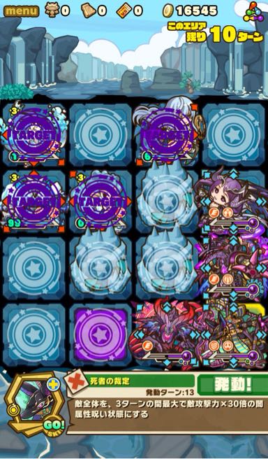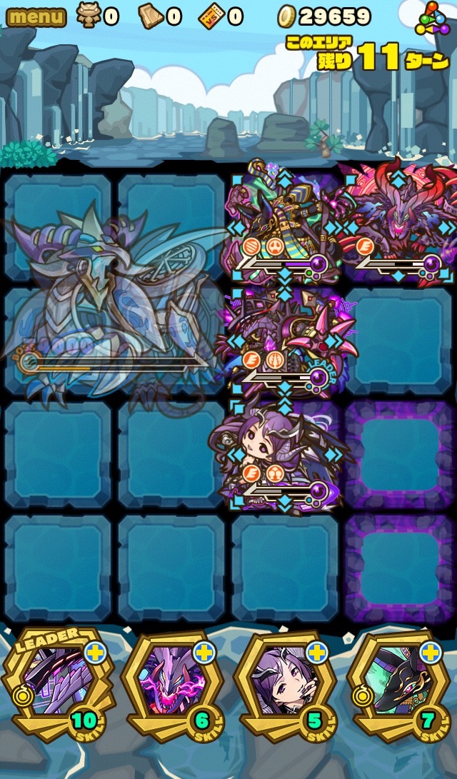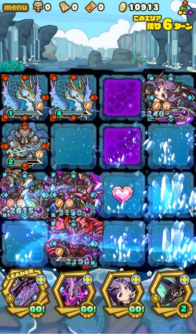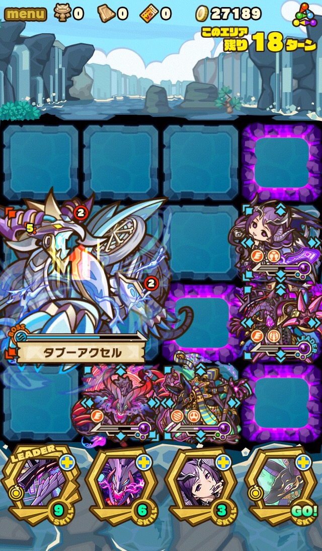 …このダンジョン、むずいっす!!!!もはや顕現並じゃないか……汗 何度もターンオーバーやゲームオーバー負けして色々編成変えて挑戦。