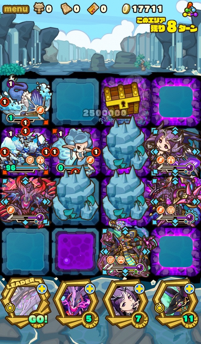 毒マスを踏んだレイスのダメージを見ると、250万食らっとる!?ど、どんだけHPあるんや。。攻撃力が半端無く高くてしかも10000×9連続ダメージを放ってくるので再優先で倒さないといけない。飛来ダメージ吸収も持ってるし下手したらスキルターンが短縮されてやばい展開になる。全ては、このレイスを倒すためサブを選んできたのだ!