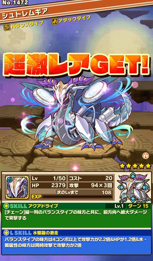 シュトレムギアはこんな感じ。突撃で絶大ダメージって雑魚処理に良さそう。リーダースキルも進化後は5倍出るし、割りと強そう。