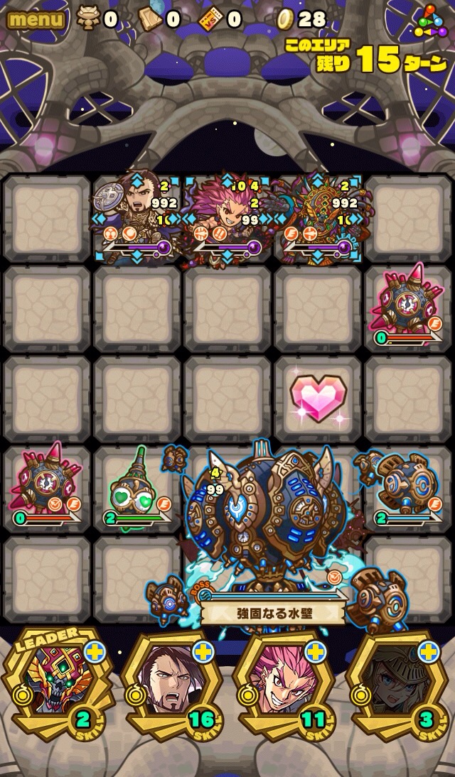 ここでのポイントは、ハートが毎ターン湧くので、すかさず取りに行きたい。全体化持ちは絶対複数体居たほうが良いです。3~4体に囲まれたら一気にやられるので状況を見てスキルを使ったり、スタンさせたり、結構頭を使います。ハートも取りにいけない距離に湧かれると回復できずに詰む時も多々あるので、運も絡みます。